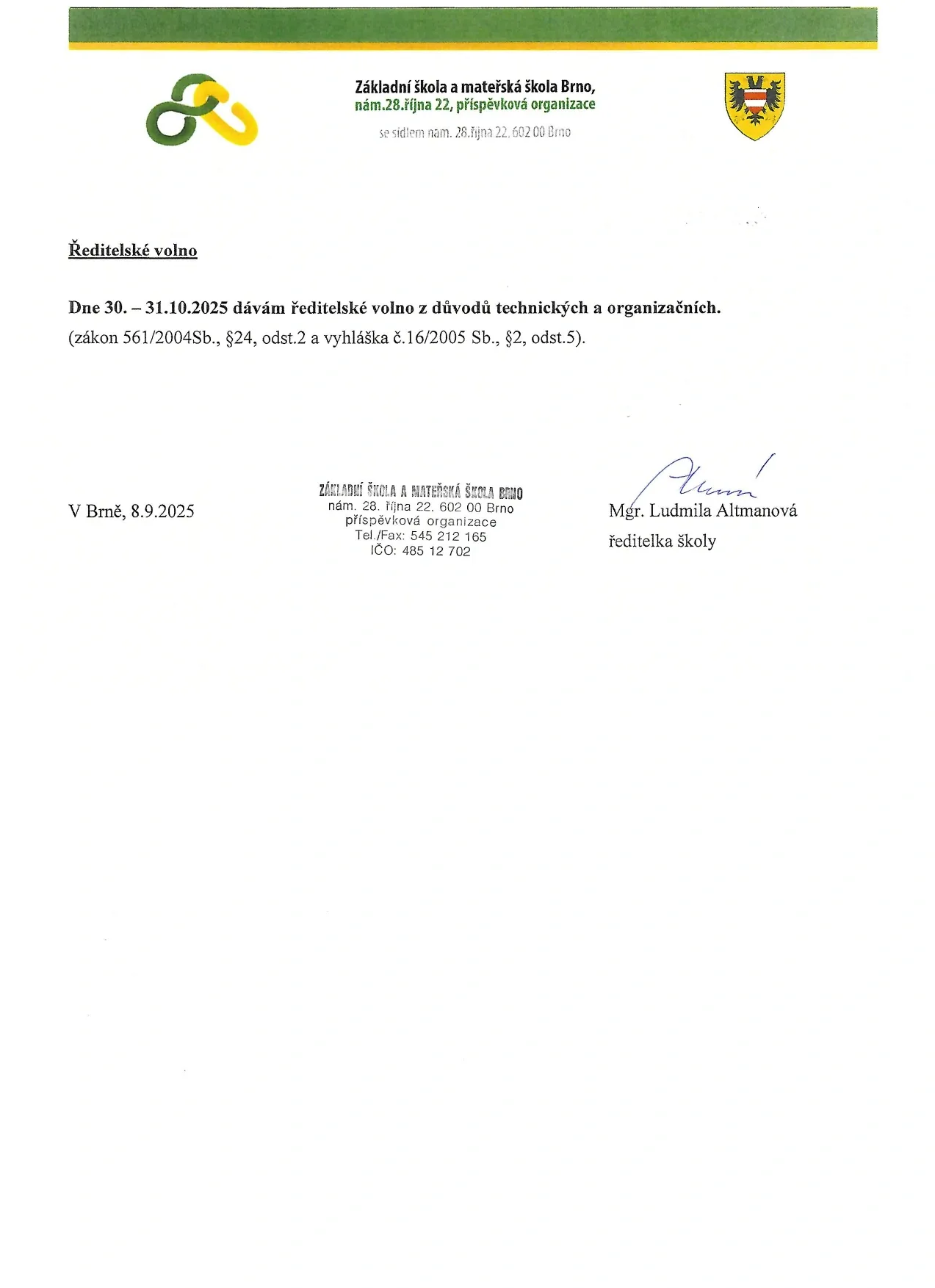 Ve dnech 30.-31.10.2025 je stanoveno ředitelské volno. Budeme se těšit na viděnou 3.11.2025.