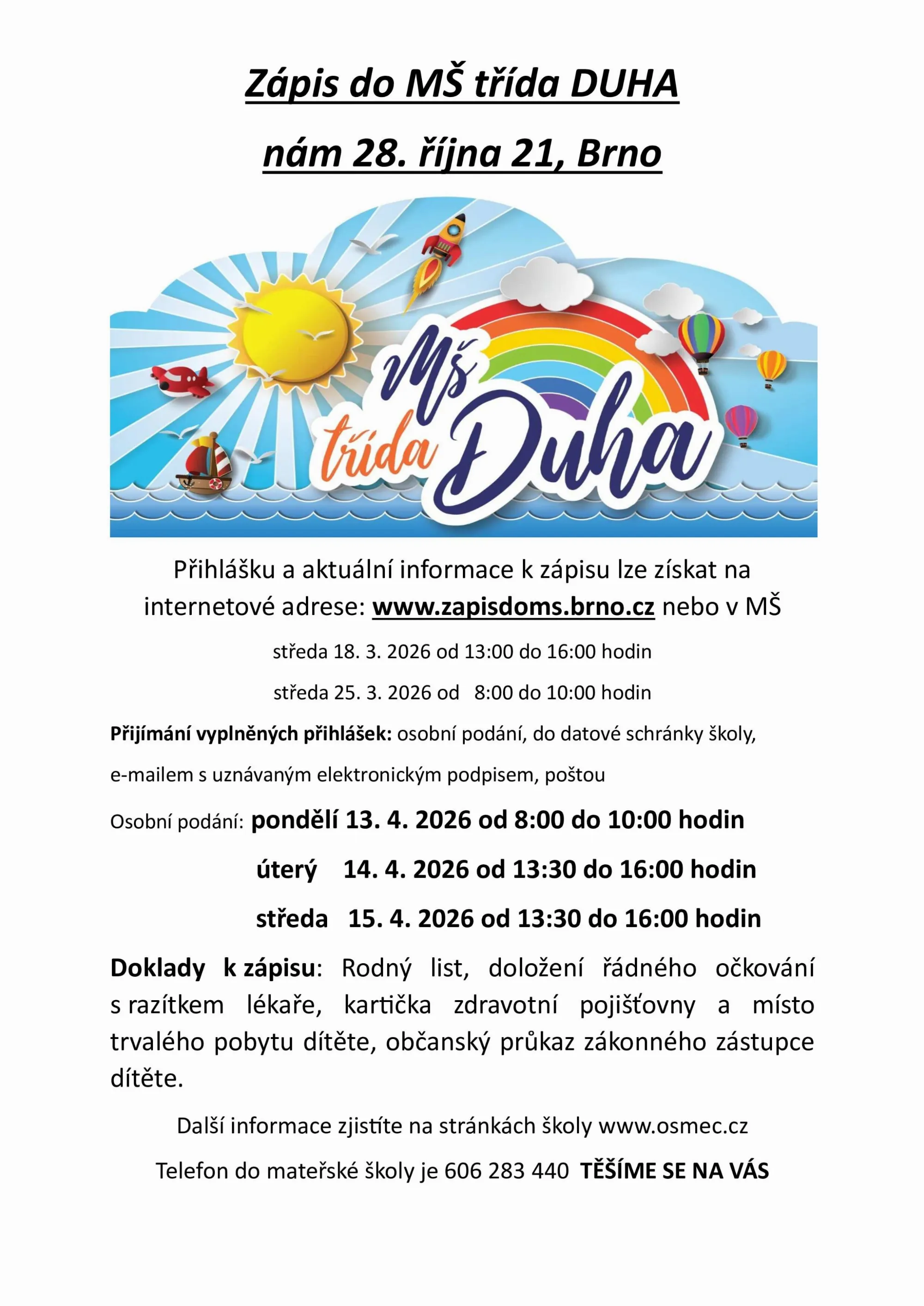 Přihlášku a aktuální informace k zápisu lze získat na internetové adrese: www.zapisdoms.brno.cz nebo v MŠ